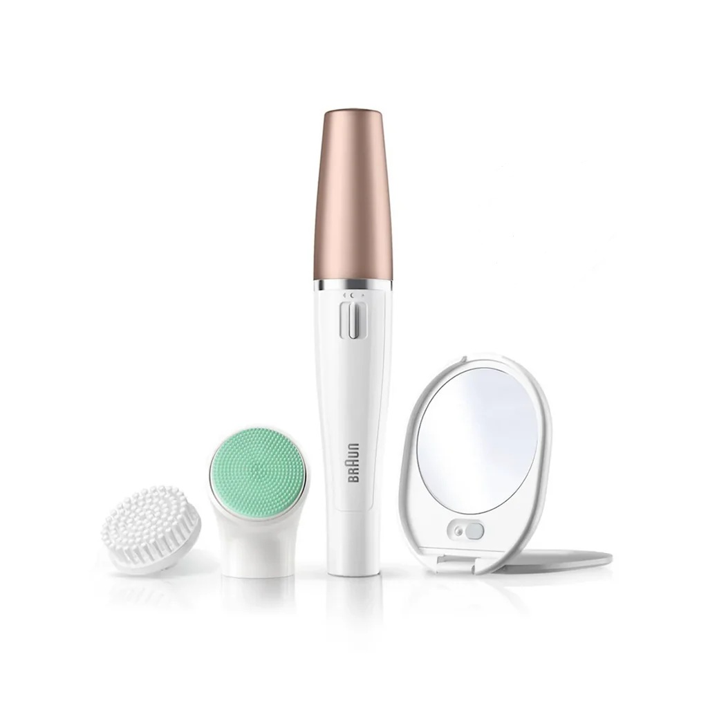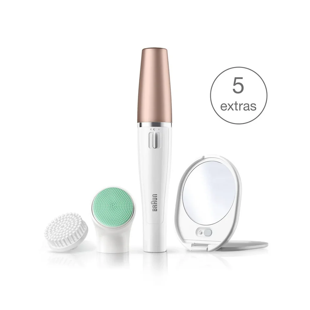 The Braun Facial Epilator & Cleansing Brush 851V features a modern and compact design, perfect for those seeking an effective facial hair removal tool. This versatile device combines an epilator and a facial cleansing brush, providing a comprehensive skincare solution in one package.