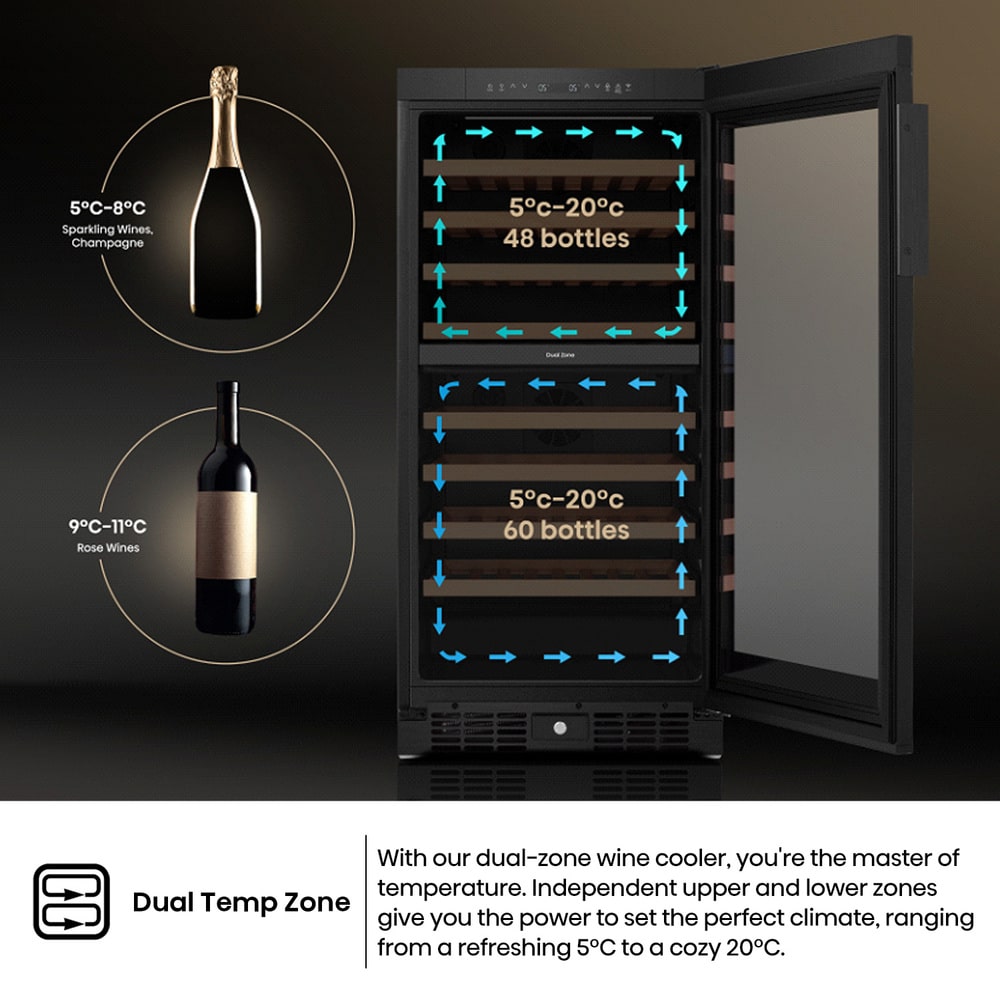 • Dual Temperature Zones: Allows for independent temperature settings for red and white wines, offering ideal conditions between 5°C and 20°C.