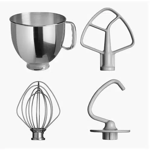 - Standard Accessories: The mixer comes with the 4.8 L steel bowl, a coated flat beater, a coated dough hook, and a 6-wire whisk.
