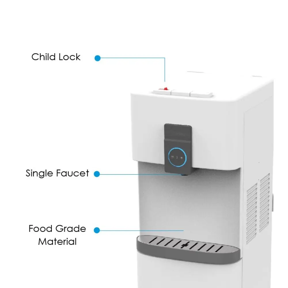 Its sleek white design blends into various home or office environments, and a bottom-loading feature eliminates the need for heavy lifting when changing the 18-21 liter water bottles. The model emphasizes hygiene and safety with antibacterial materials in high-touch areas and a child safety lock for the hot water.