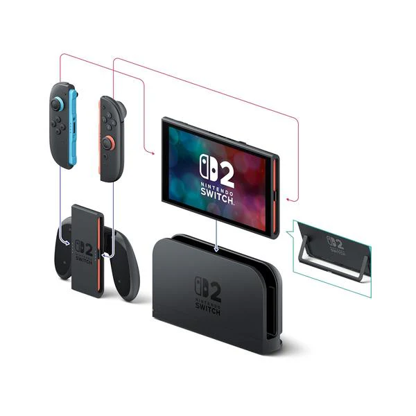 • Magnetic Joy-Con 2 Controllers The redesigned controllers use strong magnets to connect to the console, replacing the rail system of the original Switch. They also feature a new “C” button for GameChat and incorporate an optical sensor for mouse-like controls in compatible games.